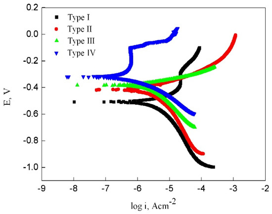 Potentiometric polarization curves obtained from electrodes with four types oxide scale.