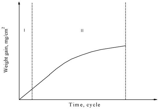 Inspection of the relationship between weight gain and corrosion cycle time for the substrates with four types oxide scales (see Figure 3) showed that the corrosion process could be divided into two stages, as shown in Figure 10.