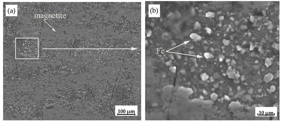 SEM images of type I oxide scale sample: (a) surface morphology of type I oxide scale; (b) Fe particles on the type I oxide scale.