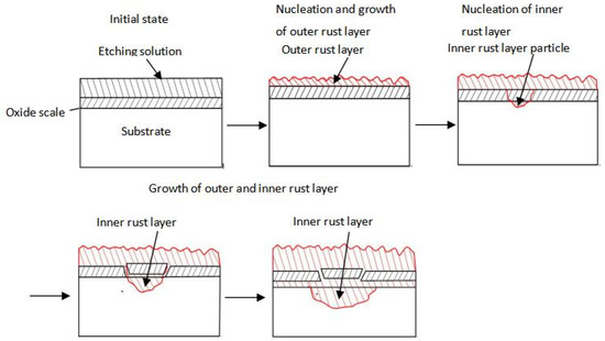 Hot rolled steel plate accounts for the largest percentage of hot rolled steel products used in China. They are typically sold directly as finished products or as raw material for cold rolled production [1]. Hot rolled steel plates usually have no surface coating, so they are susceptible to atmospheric corrosion during transportation or storage and electrochemical corrosion caused by water in the stack or roll [2]. Steel waste due to corrosion is 10−20% of the annual output in China. The corrosion of hot rolled strip is mainly due to an electrochemical reaction in which corrosion products are formed continuously under a water film in an atmospheric environment [3,4,5]. The surface of hot rolled steel strip is susceptible to the formation of a very thin water film due to adsorption in a humid environment. The non-uniform composition of the hot rolled steel strip surface, or deformation under uneven loading, can generate different electrode potentials in adjacent sections, analogous to the formation of many micro-batteries [6]. In the anode region, the steel matrix is oxidized into Fe2+ in the water film. In the cathode region, dissolved oxygen in the water is reduced to OH−. OH− can bind with Fe2+ to form a white phase of Fe(OH)2 Fe(OH)2 is then oxidized to Fe(OH)3 in the presence of oxygen and water [7,8].