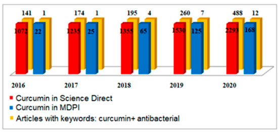 Total number of articles on “curcumin”, published between 2016 and 2020, in different databases.