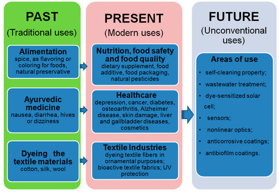 The use of curcumin in the field of sensors is already known, but research continues in the development of new structures and detection methods depending on its field of use, either in the medical, food [23,24,25], or environmental protection fields [201]. Its application in the development of nanomaterials for antimicrobial and antibiofilm coatings for multiple surfaces, necessary in both the food and medical fields, will continue to be given special attention. In addition, there are new uses in the application of products with self-cleaning properties [202] or anticorrosive coatings [203]. Developing new composite materials with curcumin has started to be addressed in areas such as solar cellules [204], nonlinear optics [205] applications in robotics, and artificial intelligence [206]. All this research on increasing efficiency in the use of curcumin for various fields is conducted with the vision of developing new eco-technologies, based on sustainable methods and principles.