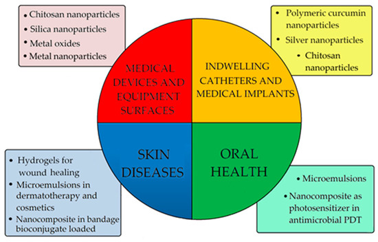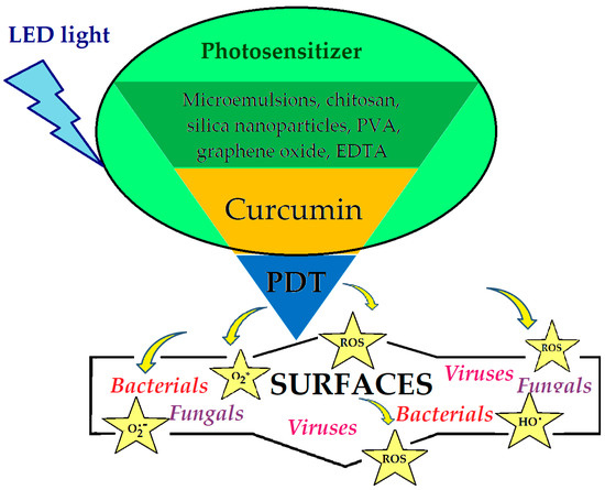 Recently, research on the treatment and prevention of dental diseases has made significant progress, especially in treatments involving photodynamic therapy [105]. In this regard, there are many studies with significant results in which curcumin is delivered as microemulsions [106,108,109] or encapsulated as nanoparticles of poly lactic-co-glycolic acid (PLGA) [111], graphene oxide [30], or silver [80]. Composites are used as sensitizers in photodynamic therapy (Figure 4) with antibacterial and antibiofilm effects on several types of bacteria (Enterococcus faecalis (E. faecalis), Streptococcus mutans (S. mutans), Porphyromonas gingivalis (P. gingivalis), and Aggregatibacter actinomycetemcomitans (A. actinomycetemcomitans)) commonly found in periodontitis, tooth decay in children, or endodontic treatments [69,71,84,85,112,113,114]. However, the most intense use of curcumin is found in skin treatments. In the past, it was used in poultices and compresses to cure various skin diseases, and as its antioxidant, antifungal, and antibacterial properties were confirmed, curcumin came to the attention of cosmetic manufacturers [140,141]. Subsequently, loading systems [142,143,144,145,146,147,148,149] were developed to increase the skin penetration effect and the photostability of curcumin. Thus, after conditioning, it was introduced in cosmetics as an active ingredient to protect the quality of the skin [59,142,143] and for the treatment of acne, psoriasis, or eczema [140,141]. Furthermore, studies have been directed to the field of the prevention and treatment of chronic wound infections, especially for diabetic patients where the healing process is slow [90]. However, to improve the solubility of curcumin, o/w nanoemulsions stabilized with PLGA [88] or N-oxide [90] have been made, which were tested against several types of strains (C. albicans, E. coli, and S. aureus) and showed antibacterial and antibiofilm activity. Mirzahosseinipour et al. [110] encapsulated curcumin in silica nanoparticles and used it as a sensitizer in antimicrobial PDT against planktonic systems and the biofilm of P. aeruginosa and S. aureus. The results of in vitro tests demonstrated antimicrobial and antibiofilm activity, without any significant cytotoxic effect of nanocomposites on normal human fibroblasts; while Varaprasad et al. [75] demonstrated the synergistic effect between silver and curcumin by increasing the antimicrobial activity against E. coli as carboxymethylcellulose nanocomposite films. Thus, considering the healing properties of curcumin, which is attributed to the presence of myofibroblast and enhancing fibronectin and collagen expression, the study authors developed composites with increased antibacterial efficacy. The results of the study, in vitro, showed 86% inhibition growth for composites loaded with silver nanoparticles and curcumin, compared to other film composites which showed only 25% inhibition growth of E. coli.