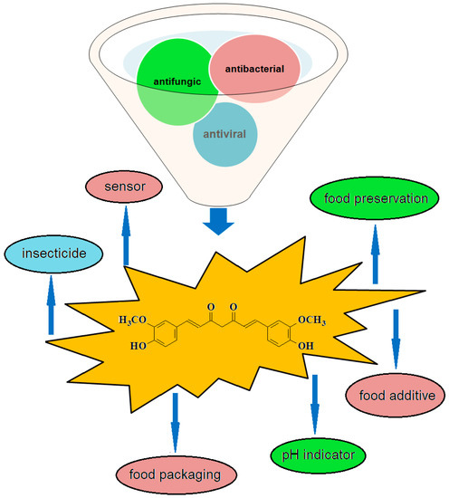 Curcumin (E100) is a food coloring, yellow-orange, with a hot and bitter taste, approved by the FAO (Food and Agriculture Organization). Restrictions imposed on the products used in food coloring or as a color additives refer to the content of arsenic (calculated as free arsenic) max. 5 mg/kg and lead (calculated as free lead) max. 20 mg/kg. The rhizome extract of the plant, curcumin powder, has over time been used in Southeast Asia in food preservation [1,4]. Recently, the recognition of curcumin as belonging to the category of antifungal and antibacterial agents of natural origin has led to the diversification, on the one hand, in the way of conditioning curcumin [121,122,123,124,125] and, on the other hand, to new sectors of use, for example, as a sensor/pH indicator [126,127,128] in the food field or in packaging [129,130,131,132,133,134,135] (Figure 5).