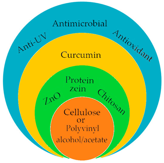 However, to compensate for these disadvantages, active packaging [131,132,133,134,135] has been developed, based on materials with antioxidant [83,132,133], antimicrobial [83,132,133,135], or anti-UV [132,135] properties which protect the packaged products from perishable factors and extend their expiration date. To obtain these packages (Figure 7), cellulose materials were most often used in the form of nanofibers or films, in the composition of which curcumin was integrated (bacterial cellulose-curcumin [131]; carboxymethylcellulose-ZnO-curcumin [133]) or in encapsulated form (cellulose bacterial-protein nanoparticles zein/curcumin [134]; cellulose nanofibers-chitosan-curcumin [135]). The treatment of composite materials with curcumin led to the modification of their physico-chemical structures by improving the elongation properties at break, thermal stability, depending on the concentration and type of curcumin delivery system. At the same time, the antibacterial and antioxidant properties of biocomposites have been improved without changing the properties of the water vapor barrier, which is an important factor for controlling humidity in obtaining an unfavorable environment for the growth and development of mold, yeast, and bacteria. The films based on different polyvinyl polymers in which curcumin was incorporated showed a slight decrease in the properties of the water vapor barrier, but without significantly affecting the other properties. These films have been used to obtain coatings that show antimicrobial photodynamic activity [107,132]. Depending on the concentration of curcumin and temperature, an antibacterial efficiency of 93% was obtained against S. aureus and Salmonella typhimurium (S. typhimurium) [119]. From the point of view of the natural additives used in the food industry, curcumin is the ideal example due to its antioxidant, antifungal, antiviral, and antibacterial properties. However, its disadvantage, as with most phytochemicals, is its sensitivity to photodegradation and its low solubility in aqueous media. To improve these shortcomings, research is continuing to find curcumin delivery systems that are non-toxic and compatible with the use environments.