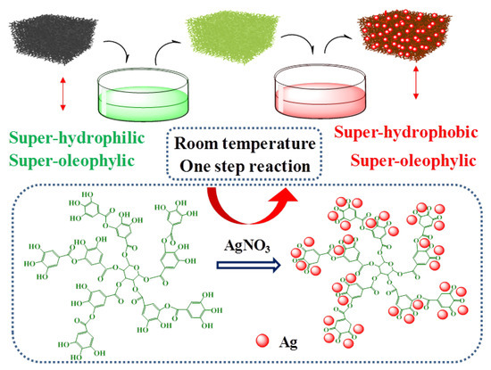 - Gao, H.; Sun, P.; Zhang, Y.; Zeng, X.; Wang, D.; Zhang, Y.; Wang, W.; Wu, J. A two-step hydrophobic fabrication of melamine sponge for oil absorption and oil/water separation. Surf. Coat. Technol. 2018, 339, 147–154. [Google Scholar] [CrossRef]