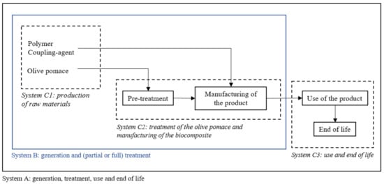 The ISO 14044 [49] states that the system boundary is a “set of criteria specifying which unit processes are part of a product system”. In order to focus on the impacts related to the development of a new biocomposite made from OP as filler, and PP or PE, respectively, as thermoplastic matrix, a “cradle-to-gate” approach life cycle assessment was carried out. This study is centered on the generation of the raw materials and manufacturing of the biocomposites. In Figure 2, system A shows the completed life cycle of the biocomposite; system B comprehends the generation of the raw materials, and the manufacturing process of the composite; system C1 shows the production of the raw materials used in the process; system C2 shows the manufacturing process of the product and the necessary pretreatment (i.e., drying, milling, etc.) to prepare the OP fraction. Finally, system C3 includes the use and end of life of the product. It is important to mention that system B comprehends the complete system boundary of the LCA herein. Namely, the system studied takes into account the production of all the raw materials needed (i.e., OP, PP, PE, and the coupling agents added to the compound to reinforce the matrix/filler interface), and the production of both composites.