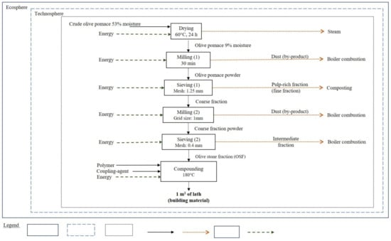 In order to build the production inventory and set the scope of the study, the functional unit is defined. Based on similar works [45,46,47] and EN 15804 [48], the functional unit chosen is the production of 1 m2 of lath (used as building material) made from the olive pomace-based composite. Figure 1a,b show a diagram of the lath and its dimensions.