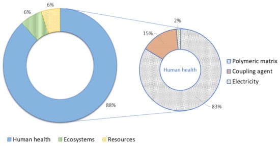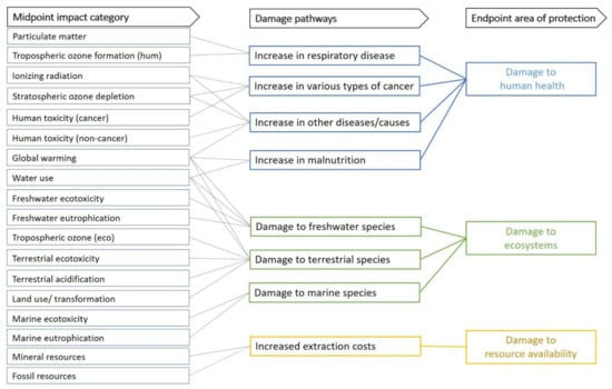 Modeling elements are used to link midpoint indicators to one or more endpoint indicators, which are representative of different topics or “areas of protection” (AoP) that “defend” our interests as a society with regards to human health, ecosystems or ecosystem services and resources [43]. The ReCiPe 2016 methodology includes 18 midpoint impact categories, and three areas of protection or endpoints [77]. The different midpoint indicators contribute to a small set of endpoint indicators as can be observed in Figure 4.