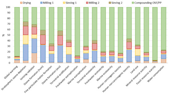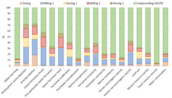 OP is a mixture of different fractions, the pulp-rich fraction (PF), stone-rich fraction (OSF) and intermediate fraction, whose percentage weights are 31.3, 56.4, and 11.7%, respectively [7]. The moisture of the crude olive pomace considered for the process is 53%, which is close to a three-phase system pomace. The moisture of the material is then decreased to 9% thanks to a drying process [7]. The energy consumption linked to the drying, crushing, and sieving of the olive pomace comes from the technical data of the machinery used and literature data [53,55,56,57]. The grinding of the olive husk gave 80% of the weight of the sample [58]. This value was used in the milling of the coarse fraction due to missing data. For the modeling of “Crude olive pomace 53% moisture”, the olive pomace dataset was adapted from the AGRIBALYSE v3.0 database according to Avadí [59].