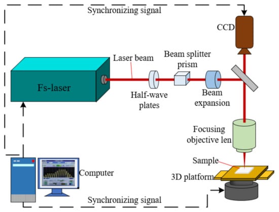 Table 1. The key optical element of this experimental system is the focusing microscope objective lens, which determines the focusing spot size and the minimum machining precision. The microscope objective lens of the Japanese Mitutoyo was adopted in this experiment. The processing system has a laser output power of 4 W, pulse width of 400 fs, and wavelength of 1030 nm. The incident laser light is linearly polarized.