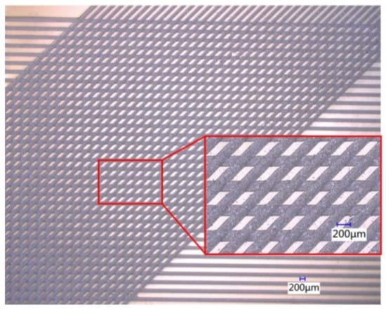 In addition, the super-high-magnification lens zoom 3D microscope (VHX-5000, Keyence, Osaka, Japan) was used to observe the surface morphology of the PMMA sample after processing. The partial morphology of the microstructure of the parallelogram square column on the PMMA surface at a magnification of 50 times is shown in