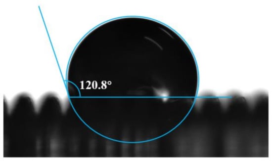 Figure 7 shows that, after preparation of PSCS on the PMMA surface, certain protrusions appear on the bosses of the structure surface. This is because the femtosecond laser beam has a Gaussian distribution and the laser pulse repetition frequency is much greater than the critical frequency, which led to accumulation of laser heat and thermal degradation of PMMA. Some of the degradation products escaped in the form of gas and some were condensed on the top of the boss. The contact angle measurement principle of the PMMA surface after microstructure preparation by laser processing is shown in