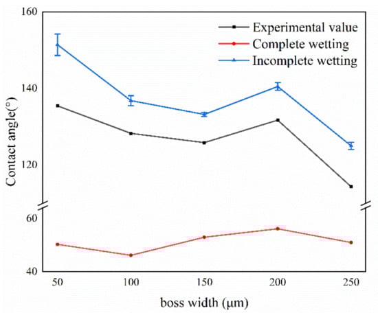 Through comparing the curves of predicted and measured contact angle under incomplete wetting model, it can be observed that contact angle was bigger under smaller boss width of PSCS. Under boss width of 50 μm, the contact angle reaches the maximum of 135.65°. From the contact angle prediction model and experimental results, it can be found that, when boss width