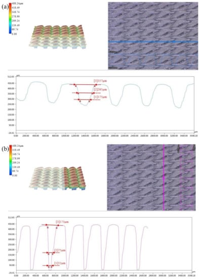 Figure 10b. This was due to that the selected processing path involves repeated processing on both sides of the boss. Hence, the groove depth at the intersection of the parallel direction of the long side and the parallel direction of the short side is larger than that of the single side of the boss, but the distance between the boss is basically the same, indicating that femtosecond laser still has the advantage of processing in the smaller heat affected zone.
