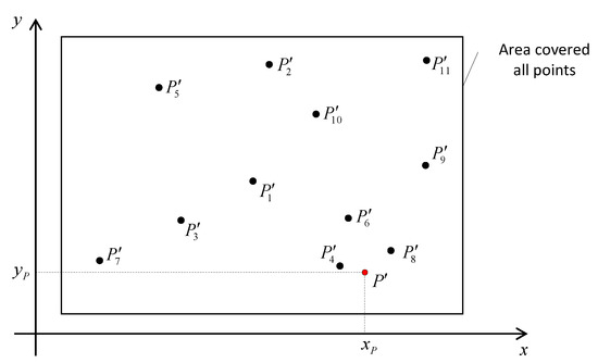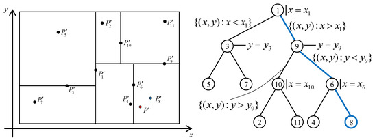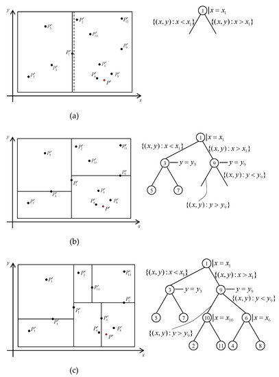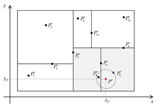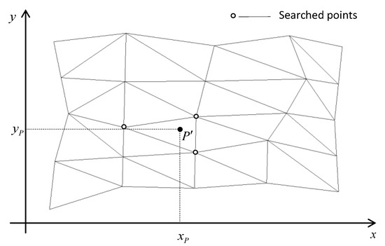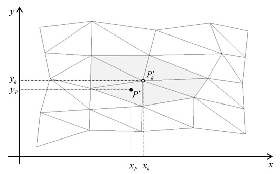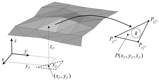 The trivial solution of the triangle identification problem consists of searching the whole set of triangles and checking if the searched element is in the surface area of this triangle. In this case, for each triangle () the plane Equation (1) should be determined, and it should be checked if the P point is in its fragment specified by vertexes . Such an algorithm does not belong to the efficient one regarding calculating, and because of three dimensionality it may prove to be problematic. Much better results can be obtained by reducing the problem to a two-dimensional issue and narrowing appropriately the set of the searched triangles. In this paper, the developed algorithm was divided into two stages.