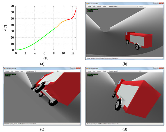 Figure 23a. The first one presets safe driving of the vehicle (green color), the second phase determines the initial loss of stability (orange color), and in the third phase the vehicle rollovers (red color). The example screenshots of this maneuver are presented in