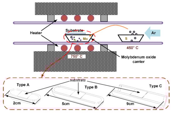 3 (purity 99.95%, Shanghai Aladdin Biochemical Technology Co., Ltd., Shanghai, China) powder was placed in a quartz boat to provide Mo source, almost at the center of the quartz tube and the sulfur powder (analytically pure, Damao Chemical Reagent Factory, Tianjin, China) was placed in another quartz boat, upstream from the MoO