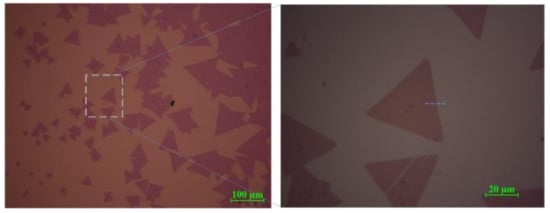 2 crystal, precursors should be delivered onto the target substrate more uniformly, through which more grains could develop and spread throughout the substrate surface. Grains grow bigger with precursors added, leading to more area coated. Grains spread randomly, thus each of them develops along different crystal orientations to form different crystal shapes. A variety of MoS