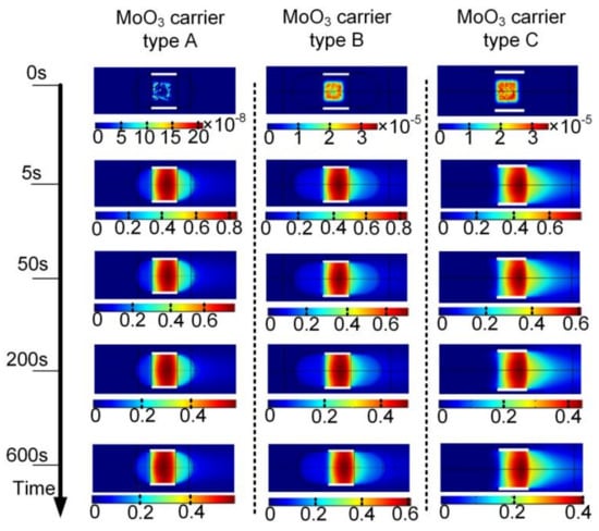 Figure 5, it can be seen that the molybdenum vapor concentration increased rapidly in the very beginning of the deposition process, namely the first 5 s presented simulation results. After 50 s, the molybdenum vapor concentration changed at a rather small rate. What should be noted is that the shape of the MoO