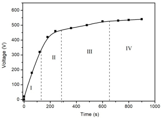 Figure 1 shows the recorded voltage–time response of the PEO process. According to previous results reported in the literatures [9,10,11], four distinguished discharge stages are usually identified during PEO process. First stage: the anodic oxidation stage before breakdown voltage, a uniform Al2O3 passive film was formed on the surface of the substrate; Second stage: the voltage continued to rise beyond the breakdown voltage of the passive film, numerous tiny bright sparks appeared and moved quickly across the surface. Third stage: the voltage grew or increased slowly; the sparks were larger but slower moving across the surface. Fourth stage: in this stage the variation of voltage was slower than that in the third stage, and the sparks generated by concentrated discharges appear as relatively larger and last longer.