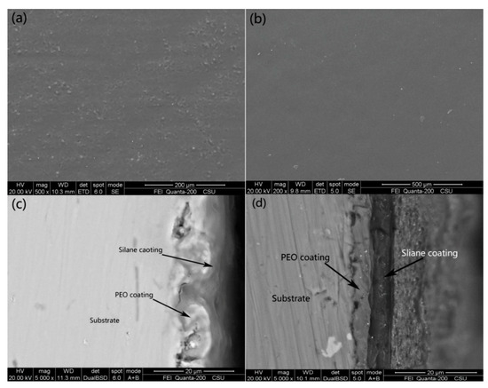 The surface of the PEO samples with a silane coating (outer) and a PEO coating (inner) is shown in Figure 3. It could be clearly seen that the porous PEO coating had been sealed by the silane layer completely (Figure 3a,b), and the silane coating was closely combined with the PEO coating (Figure 3c,d).