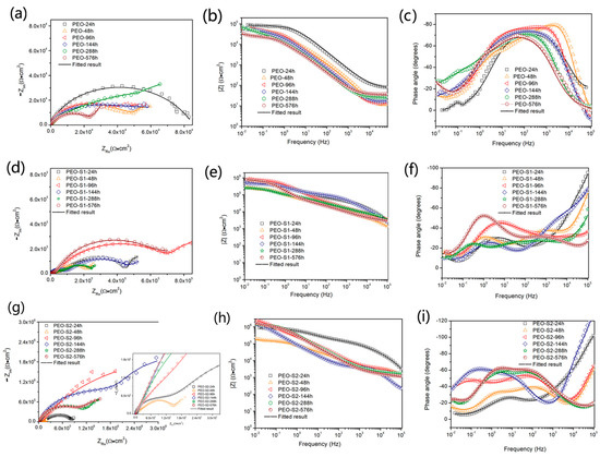 Nyquist and Bode plots for the coatings on UNS A97075 alloy immersed in a 3.5 wt.% NaCl solution: (a–c) PEO coating; (d–f) PEO-S1 coating; and (g–i) PEO-S2.