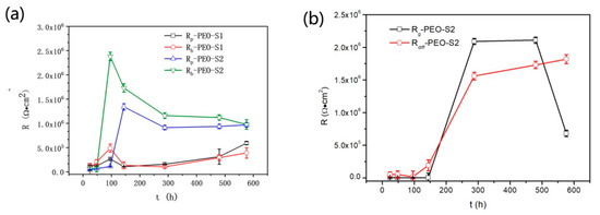 The EIS results for PEO-S1 coating are displayed in Figure 6d–f. The low frequency impedance of PEO-S1 remained at 106 Ω·cm2 and with small changes compared to that of PEO-S2. The fitting results of PEO-S1 are shown in Figure 6d–f. The fitted parameters are shown in Table 3. According to Table 3 and Figure 9a, the resistance of the PEO-S1 coating was close to that of PEO-S2 after immersion for 576 h, suggesting that the thickness of the silane layer has less effect on the corrosion resistance of the coating.