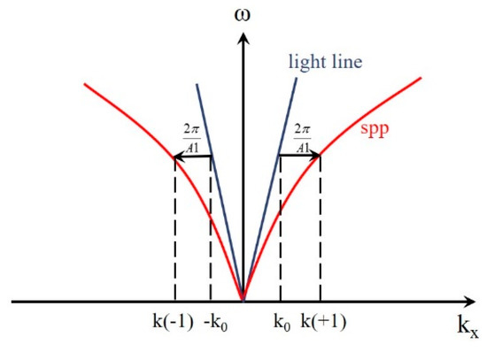 The symmetric Si grating divides the incident light into many orders. The wave vectors of different orders can be determined by the formula: k(i) = k0sinα + 2πi/A1. In which k0 and k(i) are the wave vectors of incident light and order, i = 0, ±1, ±2... ±n, α is the incident angle. With proper parameters, the order (+1, −1) can connect the plane propagating surface plasmon waves. It can be seen that the coupling resonance between the surface plasmon mode and the incident light leads to strong absorption. Through the wave vector matching condition [52], the coupling process can be expressed as Equations (1) and (2):