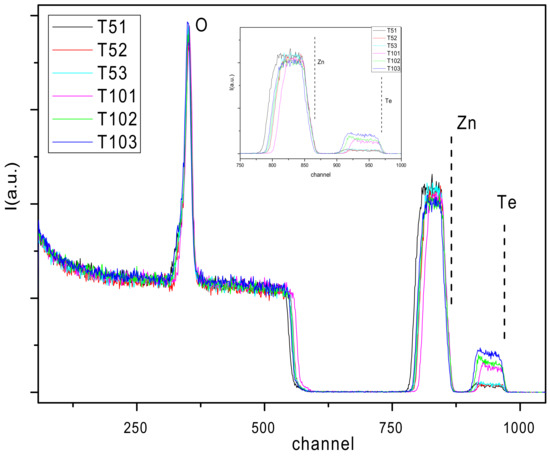 Rutherford Backscattering Spectroscopy (RBS)-fitted spectra from all samples. Zoom inset shows the different Zn and Te concentration profiles more clearly.