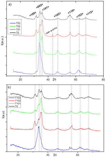XRD spectra of the A and B sample series are shown in Figure 3a,b, respectively. In both figures, the spectra were displaced vertically for clarity. The reference spectrum from ZnO appears at the top of Figure 3 to facilitate comparison. The intensities and Full Width at Half Maximum (FWHM) from the main crystallographic orientations point to a low crystalline quality in this reference. Vertical black dot lines were drawn as a visible guide for identifying positions of the main Bragg reflections detected after Gaussian adjustment of the peaks identified in the ZnO diffractogram. The main crystallographic orientations denoting the formation of polycrystalline hexagonal phase [32] w-ZnO is more strongly manifested in the spectra of samples with the lowest Te content in both series. In sample series A (as illustrated in Figure 3a), for sample T51, the Bragg reflections observed in the w-ZnO reference are clearly identified. However, the peak associated with the <101> crystallographic orientation of w-ZnO becomes the most intense, instead of the one corresponding to <002> crystallographic orientation as is generally accepted for this ZnO phase. On the other hand, it is possible to identify a very weak Bragg reflection in this sample, around 2θ = 43.21°, which was attributed to the <220> crystallographic orientation of ZnTe cubic phase (b-ZnTe) [33,34]. In this series, for higher Te content, i.e., samples T52 and T53, the <002> crystallographic orientation becomes prominent. It is significant that in the T53 sample diffractogram with the highest Te content, the w-ZnO structure was noticeably weakened, with the presence of a unique broad peak along the <002> orientation. These observations can lead to the suspicion that important structural changes occurred in the samples with increasing Te content which will be more evident in the following analysis. Particularly, in the aforementioned fits, slight shifts were observed in the positions of the most pronounced diffraction peaks characterizing w-ZnO with the incorporation of Te atoms in its framework.