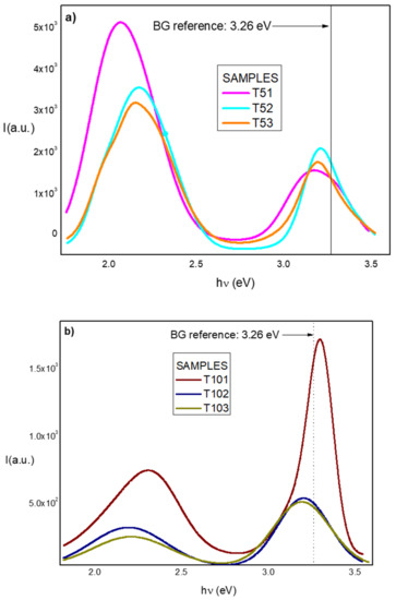 In Figure 5a,b, the different shifts experienced in all spectra are illustrated. In sample series A, the BG shifts were between 60–20 meV for samples T51 and T52 respectively, i.e., towards ultraviolet range with respect to the value obtained for the ZnO reference. In sample T53, the shift was 30 meV towards the violet region. In sample series B, the BG shift of the samples T102 and T103 was towards the violet at approximately 60 meV. However, sample T101 had behaved very differently; its BG shift was towards ultraviolet reaching the value of 3.3 eV, equal to that obtained from the Tauc Plot for the reference sample, T0, and very near that of the BG standard value for ZnO at room temperature. The trend towards a decrease in the intensity of the transition from band to band (B-B) as well as the decrease in BG to around 3.2 eV and the increase in FWHM when the tellurium content increases is justified by the increase in sample defects with the increase of the dislocation density, as shown in Table 4. In addition, an overlapping of delocalized defect states with the upper part of the VB could cause a rise in the VB edge, and therefore, a decreasing BG, as was reported previously [48].