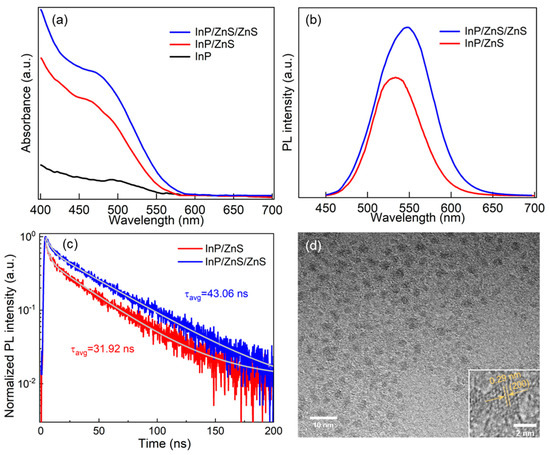 Figure 1b, the second ZnS shell improves the PL intensity substantially, reaching a PLQY of 78.5% for the InP/ZnS/ZnS QDs. Additionally, the second ZnS shell redshifts the emission peak to 547 nm with a FWHM of 77 nm. The redshift confirms the epitaxial growth of the second ZnS shell that extends the carrier wavefunctions to the shell. The PL decay results confirm the effective surface passivation by the second ZnS shell. As shown in