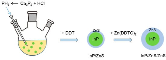 5, initiating the nucleation and growth of InP QDs. The growth was conducted for 30 min. For the growth of ZnS shell (InP/ZnS QDs), the growth solution was cooled to 160 °C, and 3.6 mL of DDT was injected. Then the temperature was raised to 220 °C again and maintained for 15 min. For the growth of a second ZnS shell (InP/ZnS/ZnS QDs), the growth solution was cooled to 120 °C and 0.217 g of Zn(DDTC)