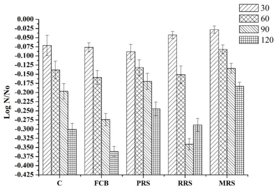Survival of free and coating-based microencapsulated L. acidophilus KLDS 1.1003 after in vitro digestion. Bars express the mean value of log transformed ratio of bacterial counts, before and during the simulated digestion for 2 h with 30 min interval. At the start of in vitro digestion reaction vials contained: control (C) 6.6 ± 0.33 log CFU; free cell bacteria (FCB) 6.2 ± 0.28 log CFU; potato resistant starch (PRS) 6.5 ± 0.33 log CFU; rice resistant starch (RRS) 6.4 ± 0.29 log CFU; maize resistant starch (MRS) 6.3 ± 0.32 log CFU.