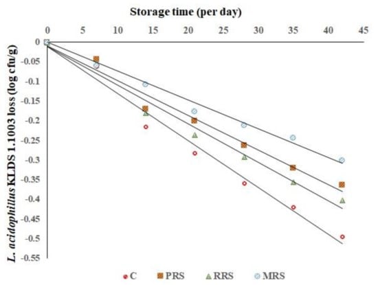 These microparticles were generated by spray drying with optimized set conditions and a storage study was conducted for 42 days at 25 °C without fixing RH. Then the impact of polysaccharide-based matrices and physical states on the storage stability and viability of probiotics was assessed. The initial probiotic cells range of about 7.8 ± 0.30–8.6 ± 0.29 log CFU/g) of free and microencapsulated L. acidophilus KLDS 1.1003 cells was taken as shown in Figure 2. The decline in viability of probiotics occurs due to the lipid oxidation of membrane and this oxidation is crucially influenced by factors like temperature and residual moisture content during storage [78]. The inactivation rate of microencapsulated L. acidophilus KLDS 1.1003 cells followed first-order kinetics, shown in Table 2 (R2 = 0.9264–0.9918) during storage, has successfully been used by other experts [79,80].