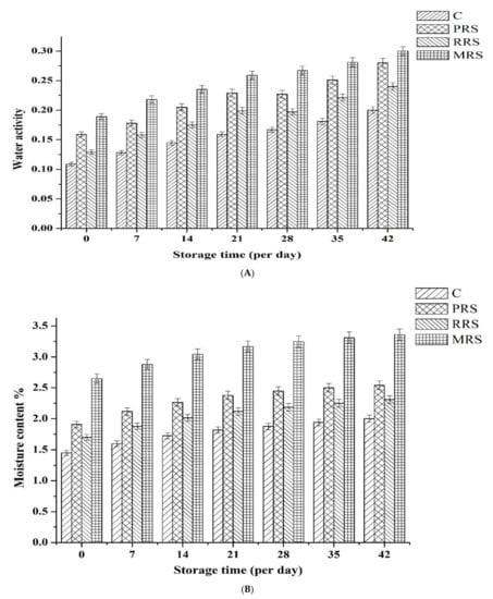 After drying and storage, the residual moisture content (MC), water activity (aw) and hygroscopicity (H) values of the spray dried powders containing microencapsulated L. acidophillus KLDS 1.1003 were significant for MC, aw and H (p < 0.01). These attributes were influenced by the composition of polysaccharide-based carrier matrices (Figure 3). The maize resistant starch (MRS)-based mixtures were categorized as containing the maximum aw and MC values, while, the control followed by RRS-based formulations had the lowest values of aw and MC (Figure 3A,B). The mean water activity of the powders ranging from 0.15 ± 0.004 to 0.30 ± 0.008 after 42 days storage is within the recommended limit of (<0.6) to ensure the microbial stability [25,97]. According to Tonon et al. [98] aw lower than (0.30 positively affect the powder constancy due to decreasing biochemical reactions, resulting products with extended shelf life. Due to lower water activity, the availability of free water is decreased for biochemical reactions which increases the shelf life of probiotic powders [99], whereas similar findings were observed by Tonon et al. [100], although the range of differences were comparatively small: PRS showed the highest aw value (Figure 3A). Lowest water activity was observed 0.10 ± 0.003 at day 0, while, with a considerable increase in aw (0.30 ± 0.007) was recorded at day 42 of storage in control and MRS respectively (Figure 3B).