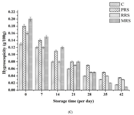 Likewise, water binding capacity and hygroscopicity (water absorption) of the constituents of the carrier medium matrix can affect aw and MC in food powders [95]. In line with our results, samples with the lowest moisture contents (control and RRS) had the lowest hygroscopicity values, and on the other hand, MRS has a high water absorption property (Figure 3C) because the final H was significantly affected by the composition of feed solutions directly after drying. The increased water activity and moisture content could decrease hygroscopicity during storage, and thus can reduce the driving force for water absorption process [16,106].