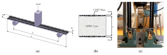 Mechanical tests: (a) virtual model; (b) cross section of the composite sandwich specimens; and (c) three-point bending test setup.