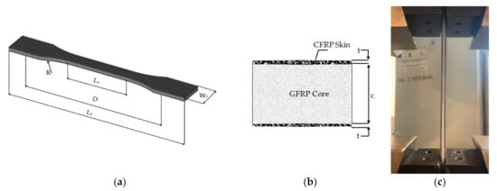 Mechanical tests: (a) dimensions of composite sandwich specimens; (b) cross section of the composite sandwich specimens; and (c) tensile strength test setup.