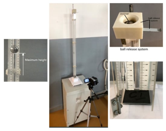 For shock impact testing with a steel ball, we used the device presented in Figure 4, designed and built in our research center. The device consists of a support holding for a steel ball, a high-resolution camera, standard line, and a rigid steel support to avoid vibratory motion. When the ball is released from its support, it falls from a height of 1 m and impacts the sample. The high-resolution camera is used to measure the recoil height and the recoil energy of the sample. Details of the impact shock energy determination and calculation can be found in the paper [45]. Characteristics of the testing device: steel ball with m = 99.81 g; rigid steel support with m1 = 3.5 kg.; standard line; high resolution camera; device to release the steel ball. The specimens had the following dimensions: length 50 mm, width 40 mm, thickness 4 mm.