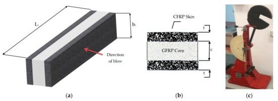 Mechanical tests: (a) dimensions of composite sandwich specimens; (b) cross section of the composite sandwich specimens; and (c) impact test setup.