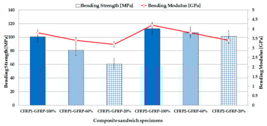 In contrast, CFRP2-GFRP sandwich structures showed a decrease in bending strength of approximately 10% between specimens with an infill of 100% and those with an infill of 20%. Another important aspect, observed after testing the sandwich specimens, was that the bending strength of CFRP2-GFRP sandwich structures was approximately 11% higher than that of CFRP1-GFRP sandwich structures when 100% infill density was used. The bending modulus showed a lower decrease for both sandwich structures CFRP1-GFRP (approximately 16%) and CFRP2-GFRP (approximately 20%) between specimens with an infill of 100% and specimens with a 20% infill.