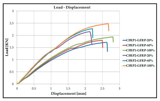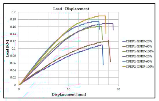 The load–displacement curves obtained from the tensile strength tests of the two types of sandwich specimens (CFRP1-GFRP and CFRP2-GFRP), manufactured with infill densities of 100%, 60%, and 20%, can be seen in Figure 9. Analyzing these curves, one can appreciate a linear evolution of the sandwich specimens at tensile strength, until reaching the failure load. From Figure 9, it can be seen that the maximum force and maximum displacement, for the two types of specimens (CFRP1-GFRP and CFRP2-GFRP), is found at an infill density of 100%. This irregularity shown on the Figure 9 is due to the behavior of the sandwich structures at the boundary between the elastic domain and the plastic domain. After this point, the curve showed a linear increase.