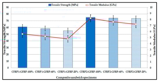 As it can be seen in Figure 8, the mean tensile strength for the CFRP1-GFRP sandwich specimens varies between 55.4 and 60.8 MPa, and the tensile modulus is between 4.8 and 5.6 GPa. The tensile strength, measured at the same infill density (100%) for the CFRP2-GFRP sandwich specimens, was approximately 19% higher compared to that of the CFRP1-GFRP specimens.