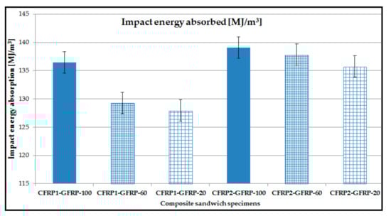 As can be seen from Figure 10, high values for impact energy absorption were registered in the fiber-reinforced composite sandwich structures with 100% infill configurations for both materials. The impact energy increases as the porosity and the number of voids from the internal structure decrease. Another factor that has led to the improvement of these properties is that polyamide filament has 15% (CFRP2-GFRP) higher mechanical properties compared to the PA6/66 copolymer (CFRP1–GFRP). Thus, CFRP2-GFRP sandwich specimens showed higher energy absorption capacity compared to CFRP1–GFRP sandwich specimens.