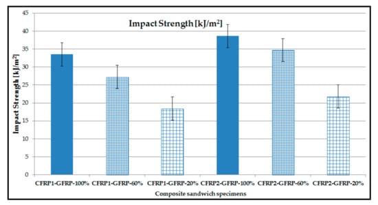 First, it is found that the impact strength of CFRP1-GFRP sandwich specimens is 13% lower than that obtained for CFRP2-GFRP sandwich specimens. As shown in Figure 11, the impact strength at different infill densities differs significantly. Thus, for both types of composite sandwich structures, the impact strength, with an infill density of 100%, is higher at about 55% compared to the specimens with an infill density of 20%. Figure 11 shows the values of impact strength for the structure CFRP1-GFRP of 18.437 kJ/m2 (infill density 20%) and 33.539 kJ/m2 (infill density 100%), and for the CFRP2-GFRP structure, of 21.771 kJ/m2 (infill density 20%) and 38.638 kJ/m2 (infill density 100%).