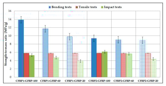 The strength-to-mass ratio analysis (Figure 12) of the two types of sandwich structures (CFRP1-GFRP and CFRP2-GFRP) was performed for the three types of tests (three-point bending tests, tensile strength tests, and impact tests) at the three infill densities (100%, 60%, and 20%). To calculate this ratio, the mean mass of the sandwich structures and the mean strength to the three types of tests (bending, tensile, and impact) were used.