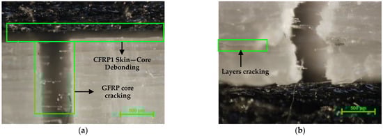 In Figure 14a, the CFRP1-GFRP composite sandwich structure, subjected to three-point bending tests, built with a filling density of 100%, was analyzed microscopically. The failure of the sandwich structure, tested at three-point bending, showed debonding between the upper skins and the core. Thus, the upper carbon fiber skin was subjected to compressive load, while the lower skin was subjected to tensile load. Debonding of the upper skin from the core of sandwich structures is a critical failure mode, and once debonding occurs, the load-bearing capacity of a composite sandwich structure decreases rapidly. Next, a crack in the fiberglass core was identified (Figure 14a), and the subsequent propagation of the crack to the lower skin (Figure 14b). The propagation of the crack and the complete rupture of the core caused a debonding between the core and the lower skin. From the main mode of failure (shearing and breaking of the core) of composite sandwich structures, it can be stated that the skins are adequately sized, thick enough, and strong, they remain unaffected after performing the bending tests. Due to material defects, especially inter-track gaps, cracks propagated in the direction of load, but a shear buckling of the core was also identified in the case of sandwich structures tested for bending at three points.