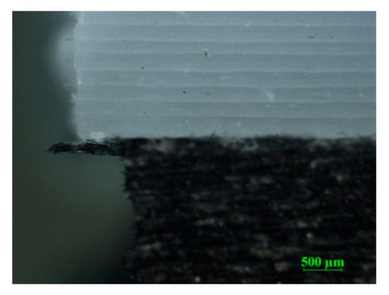 Figure 18a shows the contour of the sandwich specimen, with a filling density of 20%, which showed minor defects between the layers of fiberglass, as well as the typical gaps between extruded glass filament layers. Figure 18b identifies layers with a 20% fill density and defects typical of the FFF process. Moreover, one can notice the poor adhesion between the successive layers on the height of extruded glass filament layers and between the two manufactured materials (CFRP1-GFRP).
